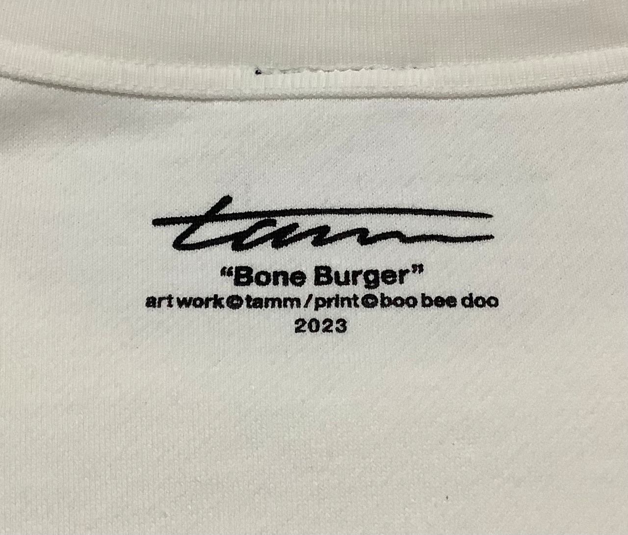 アーティストTammと初のタッグを組ませて頂き人骨と獣の骨で構成されたTamm傑作“Bone Burger”のオリジナルグラフィックをboo bee dooでアパレルに落とし込みました。